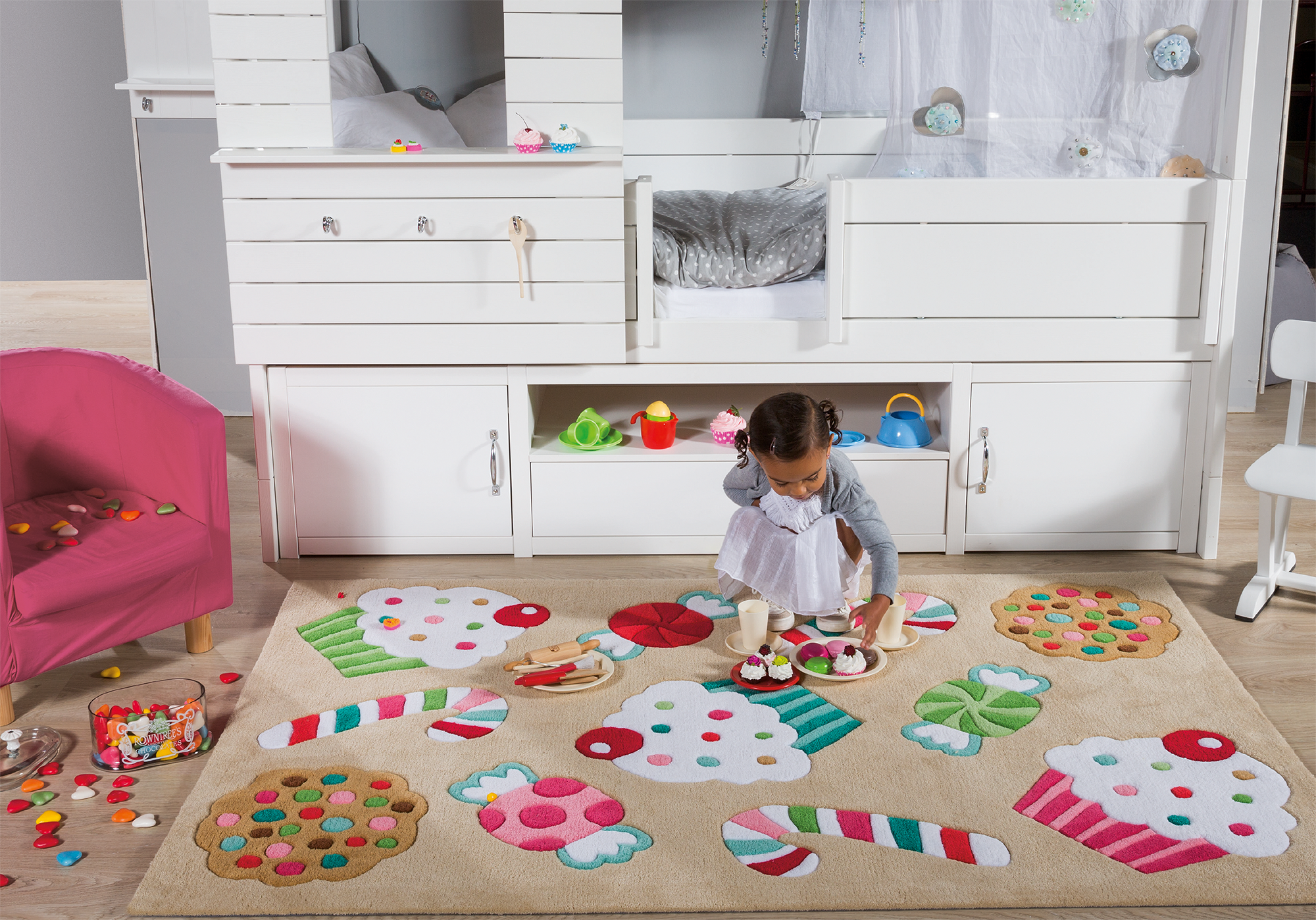 En ben je op zoek naar iets voor een meidenkamer is dit Sweet & Cupcakes kleed moeilijk te weerstaan. Het kleed is bezaaid met allerlei zoets en lekkers en zo is het elke dag feest. Ook dit kleed is vlekbestedig dus is er gemorst met het eten van al dat lekkers? Niet erg! Met een vochtig doekje haal je de vlekken er zo weer uit!